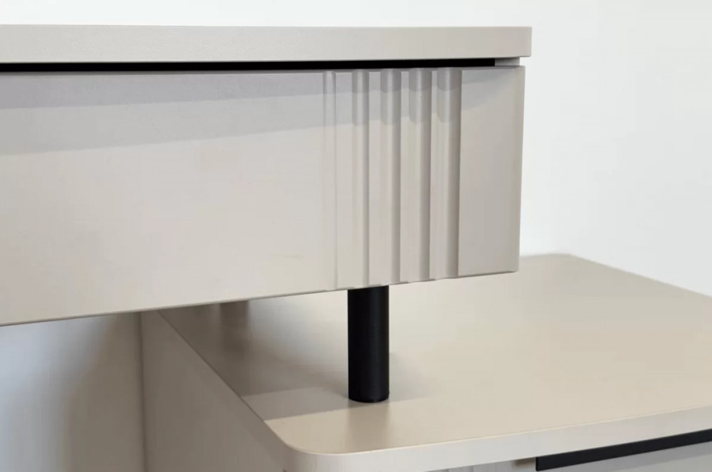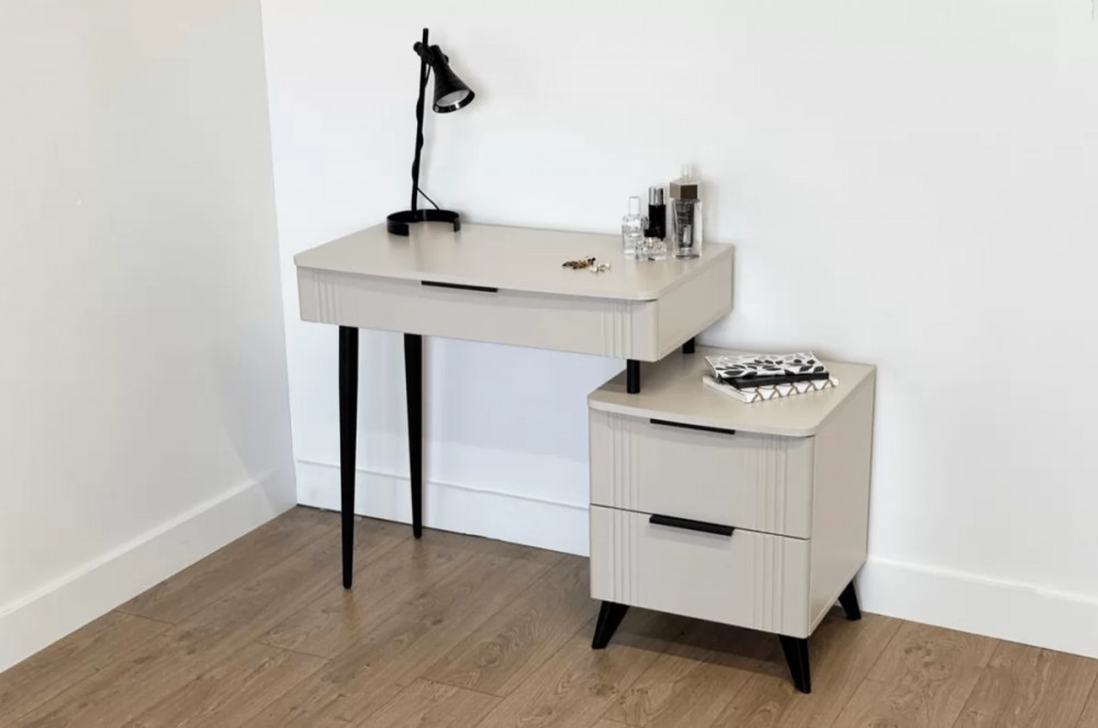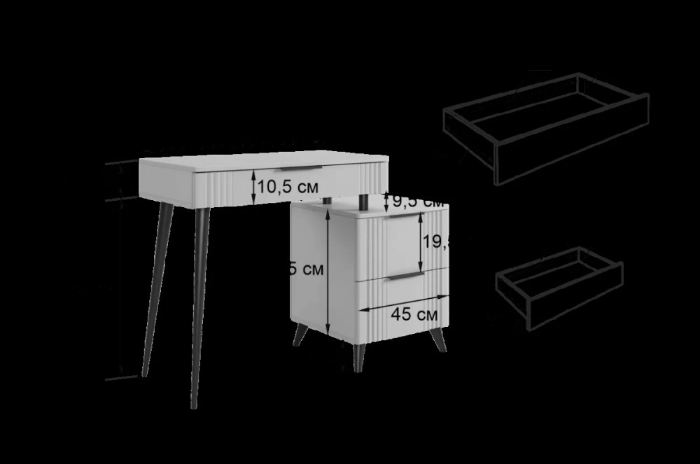 Благодаря своему дизайну трюмо «Катрин» легко впишется в любой интерьер и гармонично сочетается с другими модулями спальни «Катрин». Выкатные ящики предоставляют достаточно места для хранения различных предметов, а возможность использования трюмо в качестве письменного стола делает его универсальным элементом мебели.