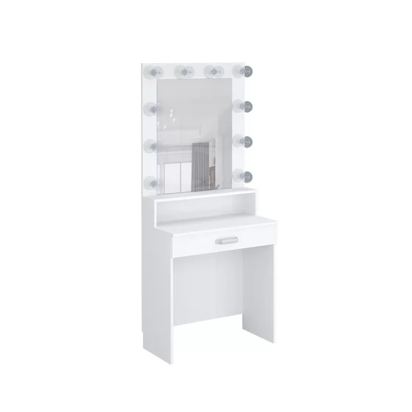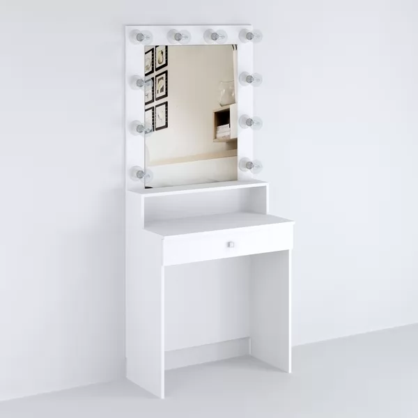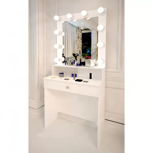 в конструкции столика есть выключатель для лампочек (лампочки в комплект не входят, так как подбираются индивидуально - в зависимости от необходимости по насыщенности и теплохолодности света), розетка, небольшая рабочая зона, полочка и выкатной ящик для косметики. А благодаря компактным размерам этот вариант будуарного уголка замечательно впишется даже в небольшом пространстве.